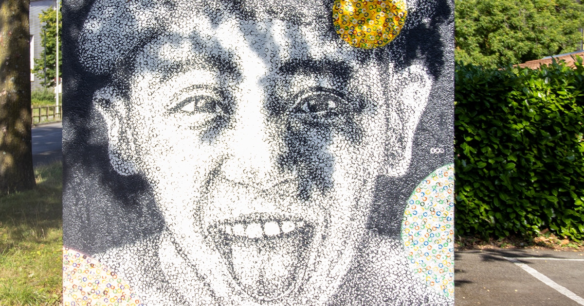 Avec son style unique fait d’empreintes de bouteilles, l’artiste célèbre ici l’enfance à travers des visages